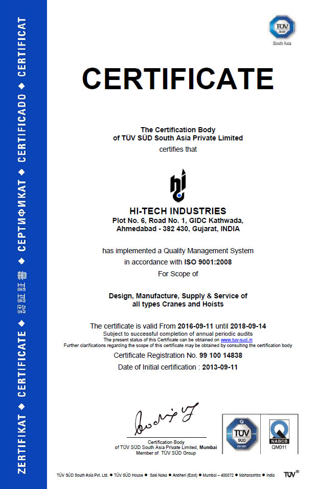 HI-TECH INDUSTRIES With a state-of-art workshop facility acquired in 4 Acres Industrial Land of Ahmedabad city having ISO:9001:2008 certification of TUV-SUD South Asia Pvt. Ltd. Hi-Tech Industries introduces as one of the leading designer, manufacturer & executor on turnkey projects of material handling equipments like EOT Cranes, Electric wire rope hoists, Flame proof cranes, gantry cranes, flame proof goodslift and custom built material handling equipment.